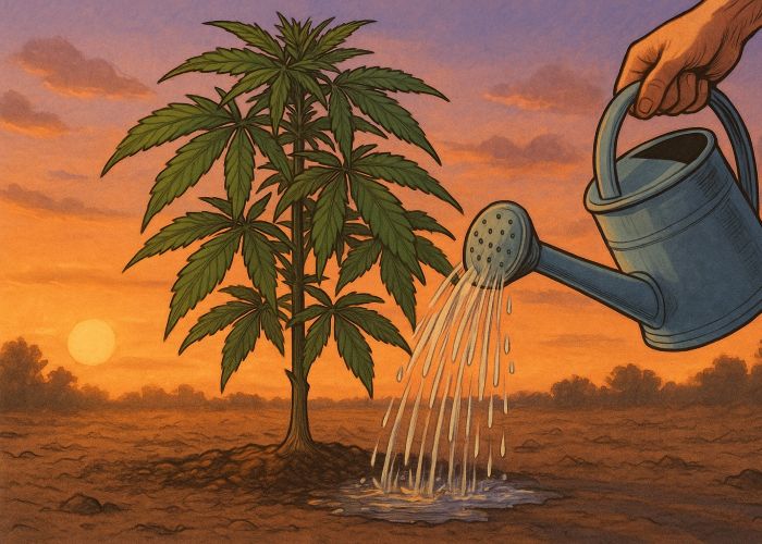 Каннабис в жаркую погоду теряет воду с бешеной скоростью. При температуре воздуха выше +35 °C и раскаленной почве, прогревающейся до +45 °C, даже обильный утренний полив зачастую испаряется быстрее, чем достигает корней. А если почва легкая или растения посажены в контейнерах, влага уходит буквально за пару часов.